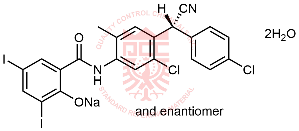 分子式: C22H13Cl2I2N2NaO2.2H2O 分子量:685.06 2*18.02 CAS号:61438-64-0(Na salt);57808-65-8(free base)